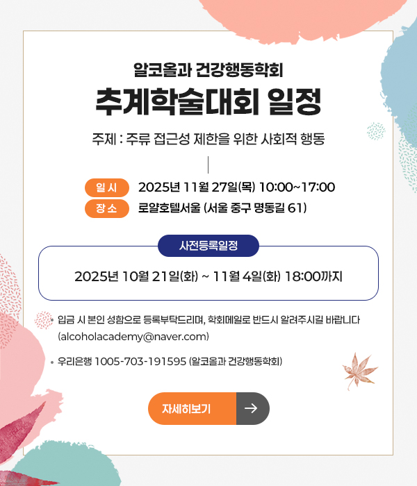 법인명: 알코올과 건강행동학회 | 사업자 등록번호: 217-82-77520 | 대표자: 이무식